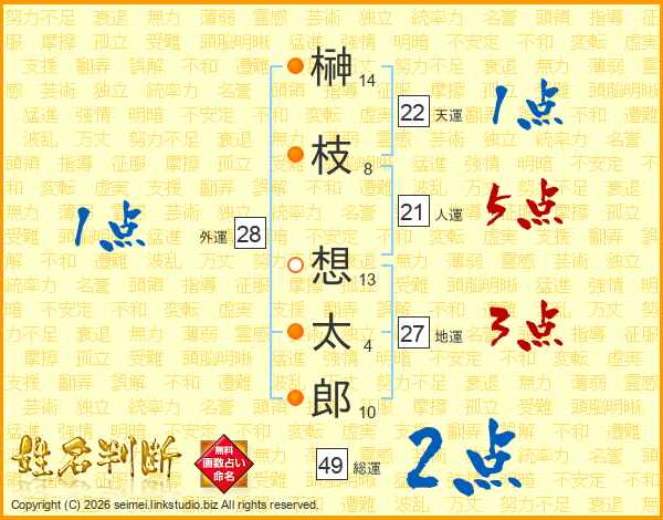 榊(14画)枝(8画) 想(13画)太(4画)郎(10画)