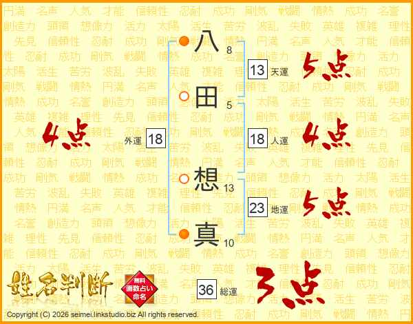 あなたの人生を表す1番重要な運勢です。生涯を通じて影響する総合運となり、主に50歳以降の晩年期に影響を及ぼします。苗字と名前の合計画数。