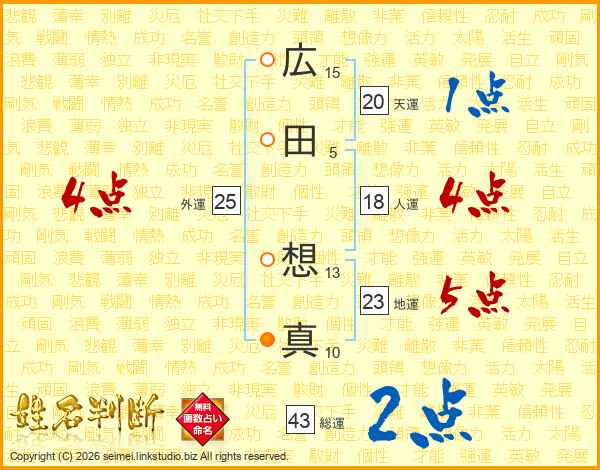 広(15画)田(5画) 想(13画)真(10画)