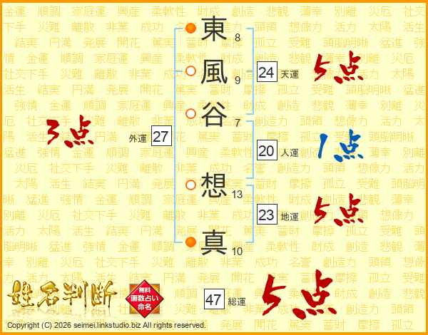 東(8画)風(9画)谷(7画) 想(13画)真(10画)