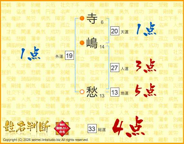 生活面を象徴する運勢です。外部から受ける影響力を表し、結婚運、家庭運や職場、環境への順応性を表します。総運から人運を引いた画数。姓や名が1文字の場合を除く。