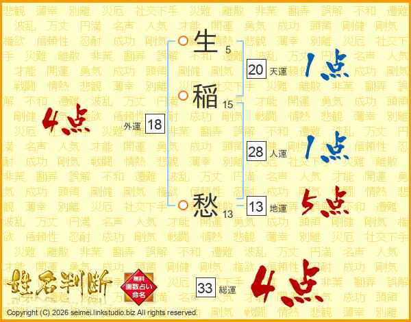 生稲愁さんの総運は33画の4点!