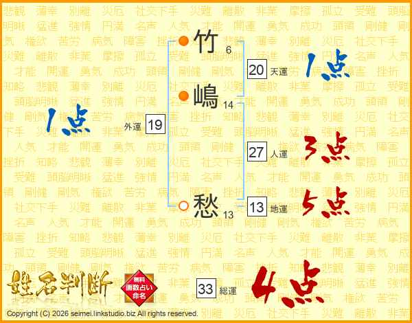 生活面を象徴する運勢です。外部から受ける影響力を表し、結婚運、家庭運や職場、環境への順応性を表します。総運から人運を引いた画数。姓や名が1文字の場合を除く。