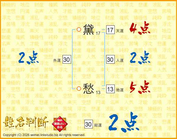 生活面を象徴する運勢です。外部から受ける影響力を表し、結婚運、家庭運や職場、環境への順応性を表します。総運から人運を引いた画数。姓や名が1文字の場合を除く。