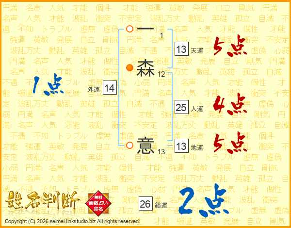 生活面を象徴する運勢です。外部から受ける影響力を表し、結婚運、家庭運や職場、環境への順応性を表します。総運から人運を引いた画数。姓や名が1文字の場合を除く。
