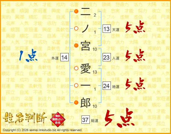 二(2画)ノ(1画)宮(10画) 愛(13画)一(1画)郎(10画)