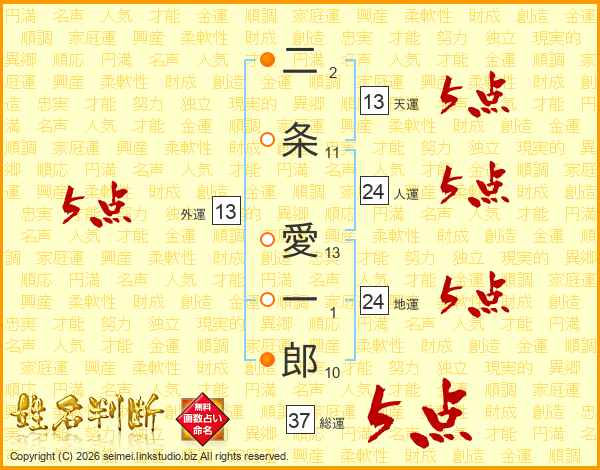 二(2画)条(11画) 愛(13画)一(1画)郎(10画)