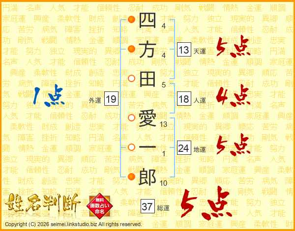 四(4画)方(4画)田(5画) 愛(13画)一(1画)郎(10画)