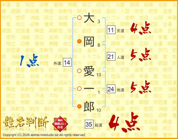 大(3画)岡(8画) 愛(13画)一(1画)郎(10画)