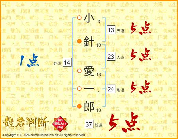 小(3画)針(10画) 愛(13画)一(1画)郎(10画)