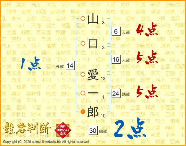 山(3画)口(3画) 愛(13画)一(1画)郎(10画)