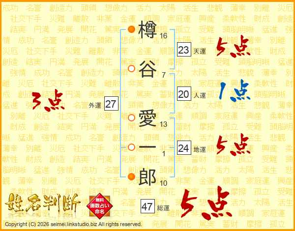 樽(16画)谷(7画) 愛(13画)一(1画)郎(10画)