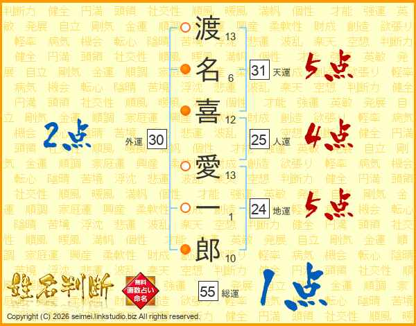 渡名喜愛一郎さんの天運は31画の5点!