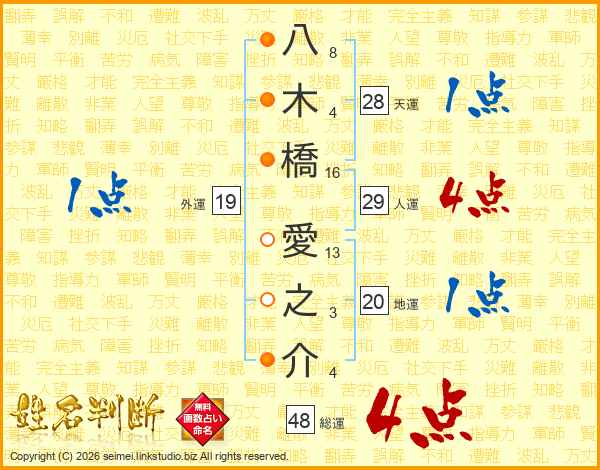 八(8画)木(4画)橋(16画) 愛(13画)之(3画)介(4画)