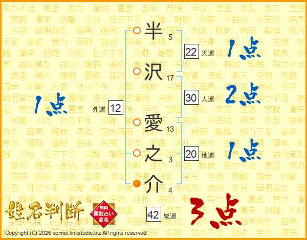 半(5画)沢(17画) 愛(13画)之(3画)介(4画)