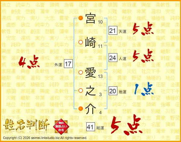 宮(10画)崎(11画) 愛(13画)之(3画)介(4画)