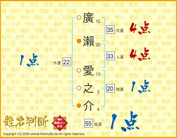 廣瀨愛之介さんの人運は33画の4点!