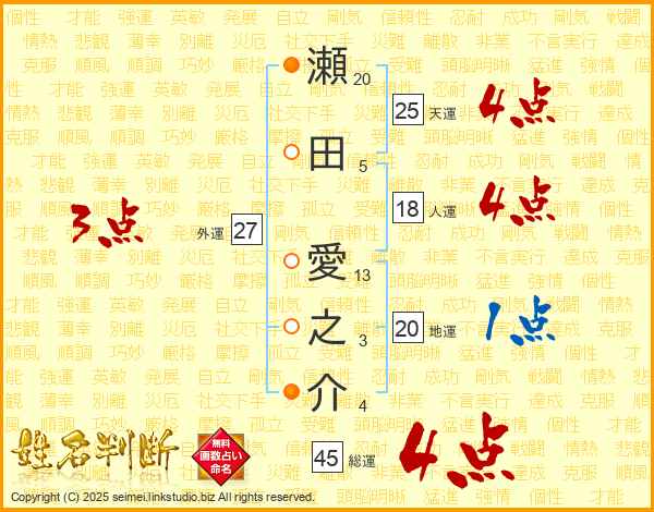 瀬(20画)田(5画) 愛(13画)之(3画)介(4画)