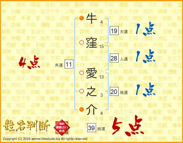 牛(4画)窪(15画) 愛(13画)之(3画)介(4画)