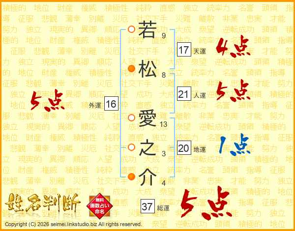 若(9画)松(8画) 愛(13画)之(3画)介(4画)