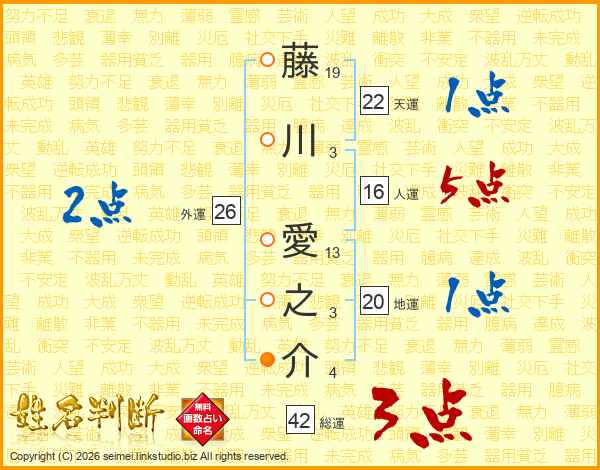 藤(19画)川(3画) 愛(13画)之(3画)介(4画)