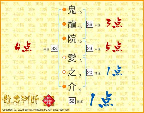 鬼龍院愛之介さんの総運は56画の1点!