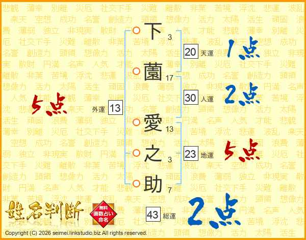 下(3画)薗(17画) 愛(13画)之(3画)助(7画)