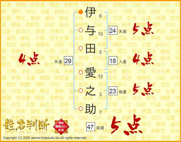 伊(6画)与(13画)田(5画) 愛(13画)之(3画)助(7画)