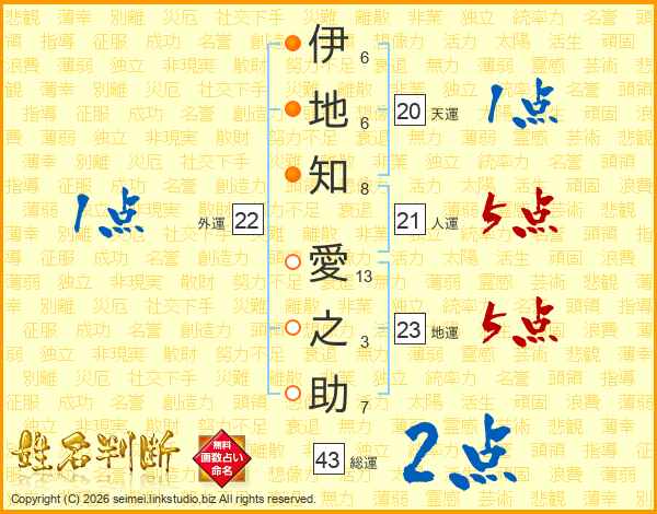 伊(6画)地(6画)知(8画) 愛(13画)之(3画)助(7画)
