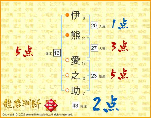 伊(6画)熊(14画) 愛(13画)之(3画)助(7画)
