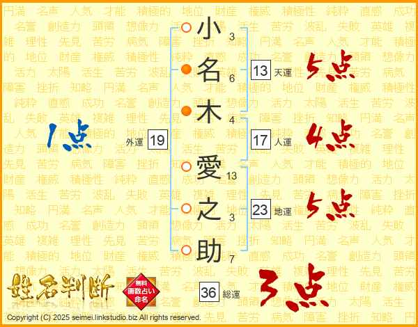 小(3画)名(6画)木(4画) 愛(13画)之(3画)助(7画)