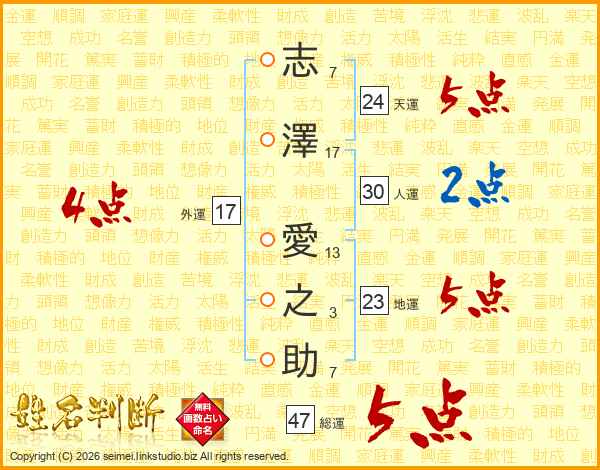 志(7画)澤(17画) 愛(13画)之(3画)助(7画)