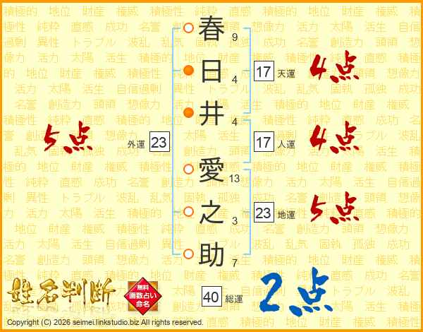 春(9画)日(4画)井(4画) 愛(13画)之(3画)助(7画)