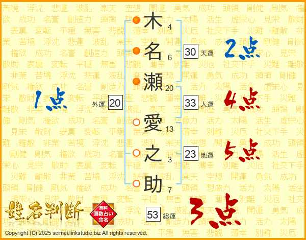 木(4画)名(6画)瀬(20画) 愛(13画)之(3画)助(7画)