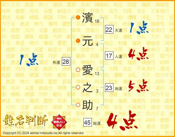 濱元愛之助さんの総運は45画の4点!