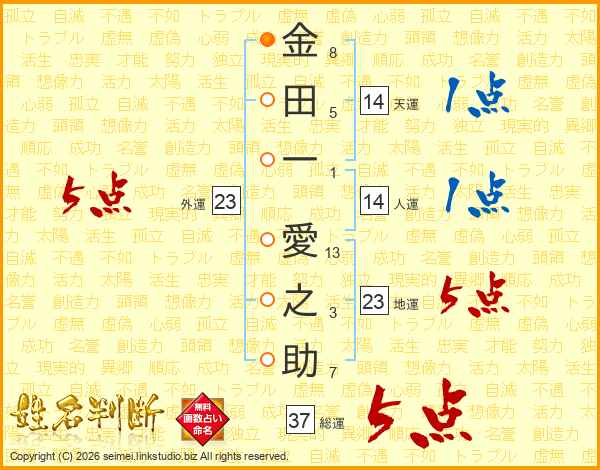 金(8画)田(5画)一(1画) 愛(13画)之(3画)助(7画)
