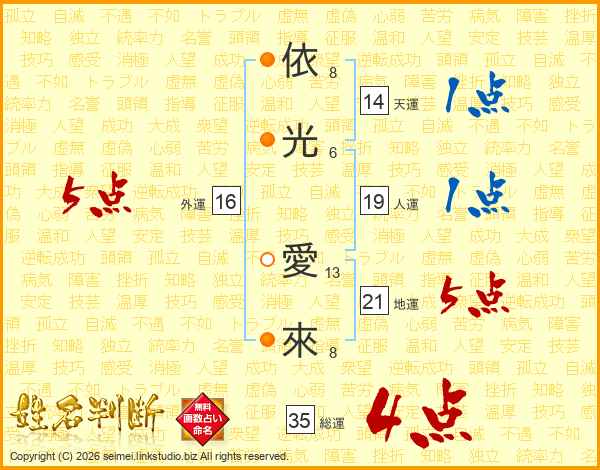 依光愛來さんの天運は14画の1点!