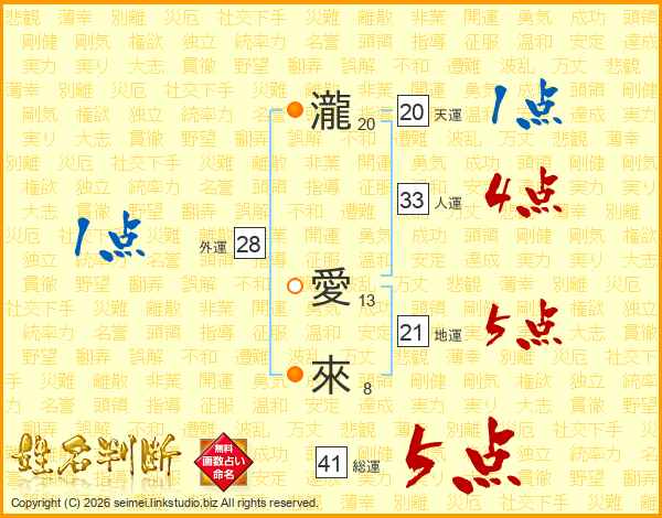 瀧愛來さんの総運は41画の5点!
