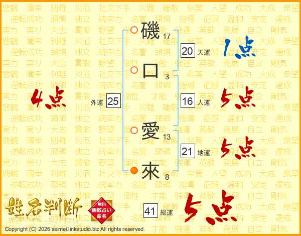 磯(17画)口(3画) 愛(13画)來(8画)