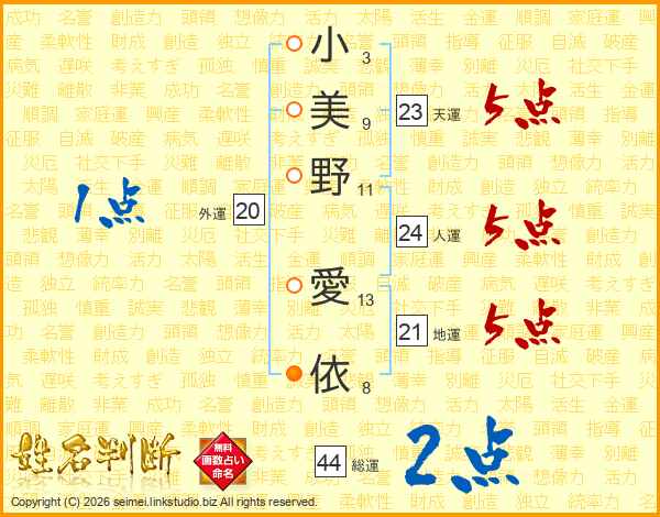小(3画)美(9画)野(11画) 愛(13画)依(8画)