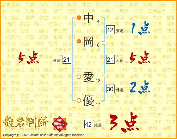 中岡愛優さんの人運は21画の5点!
