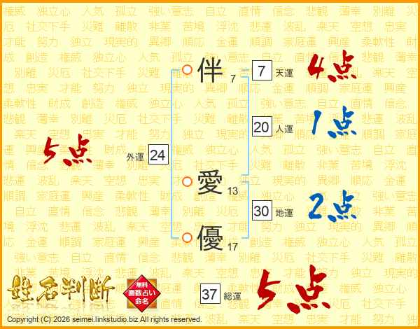 伴(7画) 愛(13画)優(17画)