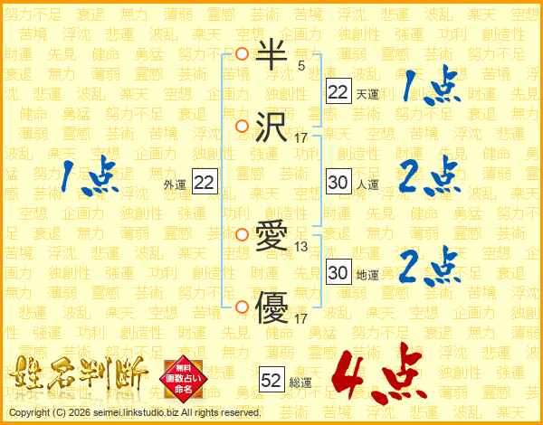 生活面を象徴する運勢です。外部から受ける影響力を表し、結婚運、家庭運や職場、環境への順応性を表します。総運から人運を引いた画数。姓や名が1文字の場合を除く。