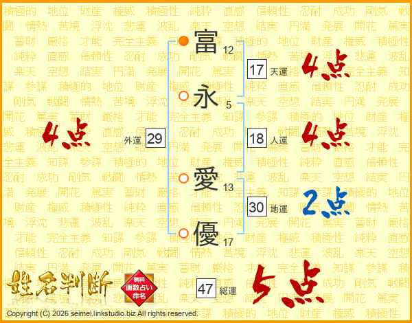 生活面を象徴する運勢です。外部から受ける影響力を表し、結婚運、家庭運や職場、環境への順応性を表します。総運から人運を引いた画数。姓や名が1文字の場合を除く。