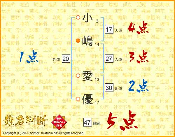 小(3画)嶋(14画) 愛(13画)優(17画)