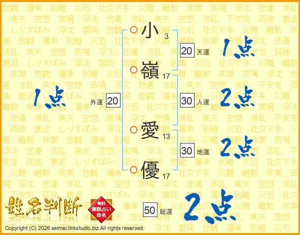小(3画)嶺(17画) 愛(13画)優(17画)