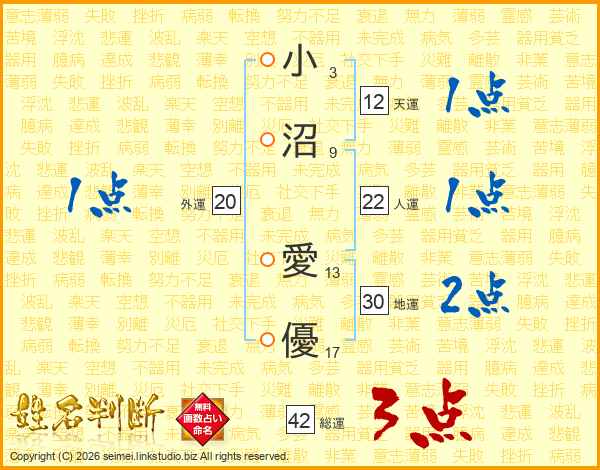 生活面を象徴する運勢です。外部から受ける影響力を表し、結婚運、家庭運や職場、環境への順応性を表します。総運から人運を引いた画数。姓や名が1文字の場合を除く。