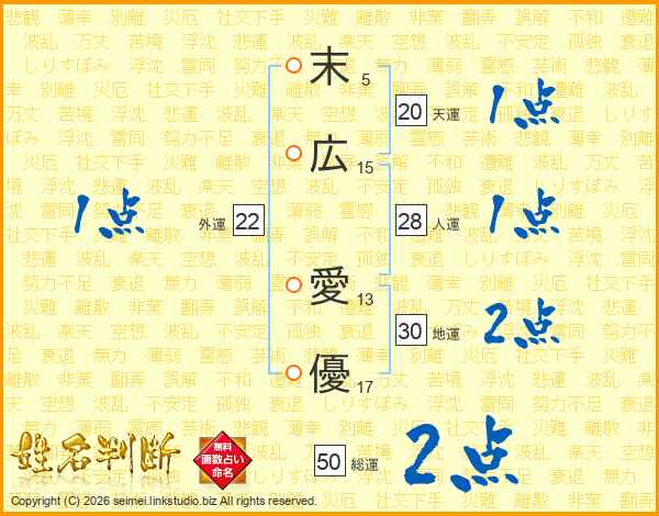 生活面を象徴する運勢です。外部から受ける影響力を表し、結婚運、家庭運や職場、環境への順応性を表します。総運から人運を引いた画数。姓や名が1文字の場合を除く。