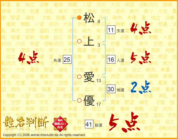 生活面を象徴する運勢です。外部から受ける影響力を表し、結婚運、家庭運や職場、環境への順応性を表します。総運から人運を引いた画数。姓や名が1文字の場合を除く。