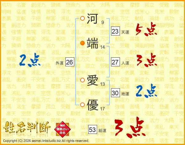 生活面を象徴する運勢です。外部から受ける影響力を表し、結婚運、家庭運や職場、環境への順応性を表します。総運から人運を引いた画数。姓や名が1文字の場合を除く。